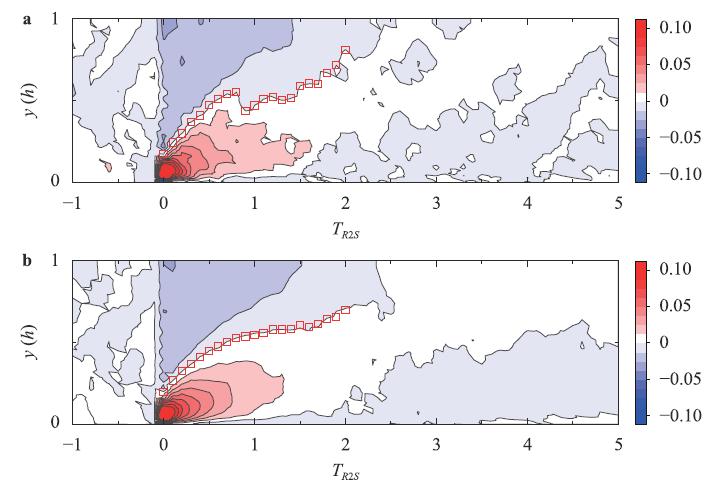 图5: 非均匀粗糙表面局部速度的时间梯度云图. (a) 单次模拟结果. (b) 多次模拟平均结果。