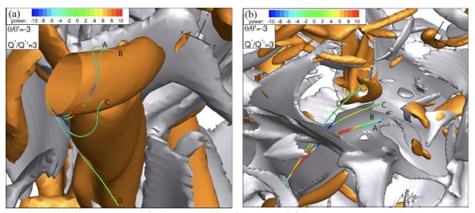 图8:湍流马赫数Mt=1.01流场中不同惯性颗粒(A:示踪粒子,B:St=0.1,C:St=1.0, D:St=5.0)遇到涡结构(a)和激波结构(b)时的运动轨迹。所有颗粒的初始位置相同,每个颗粒的迹线由瞬时功率进行染色。