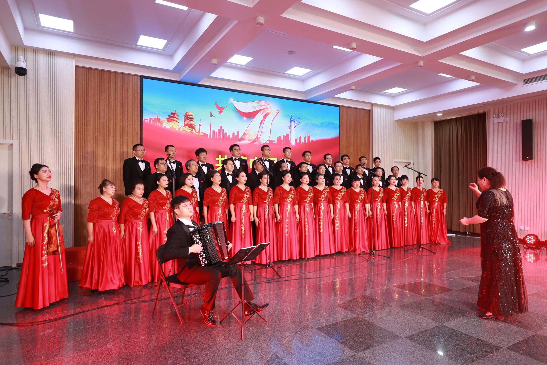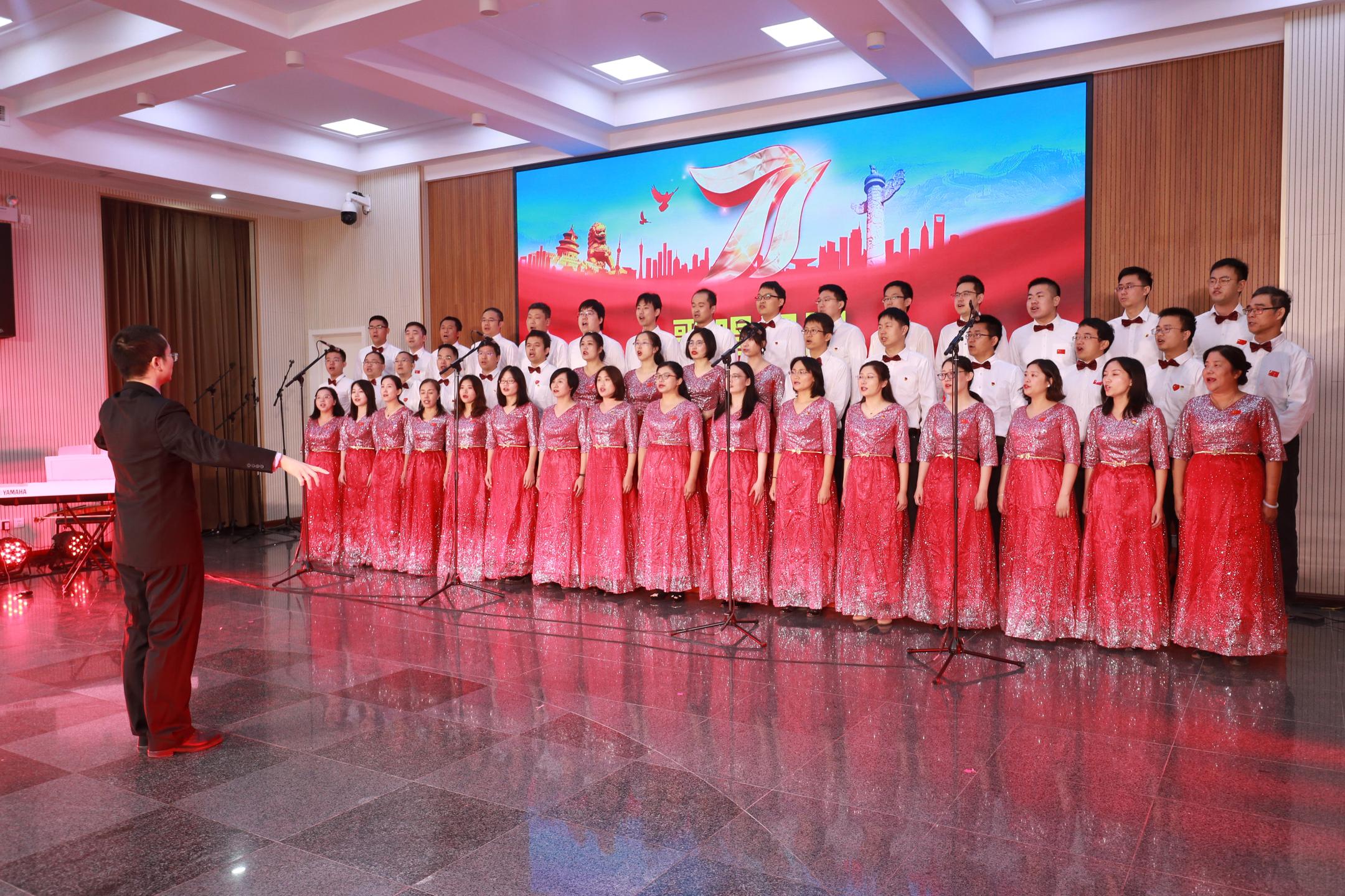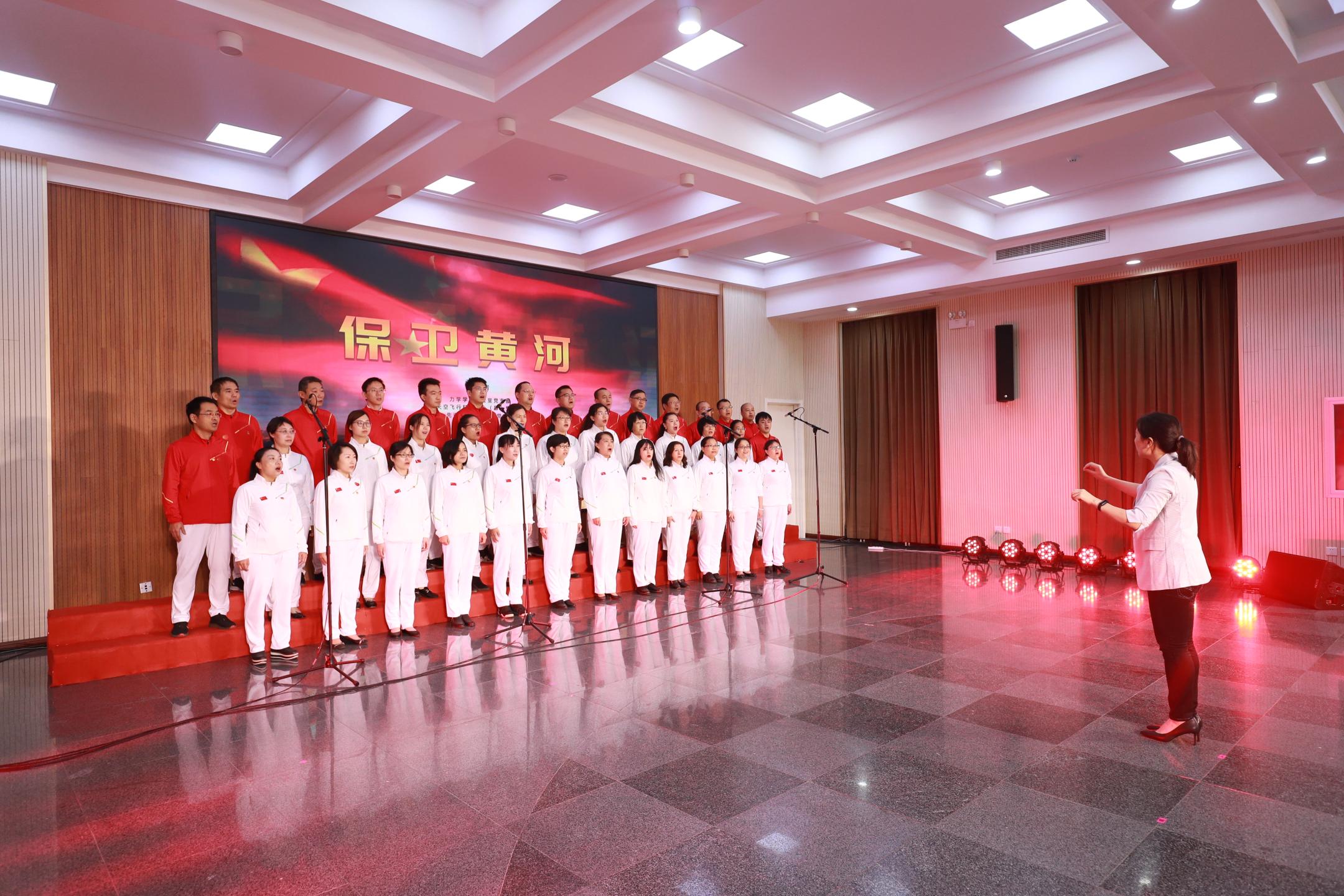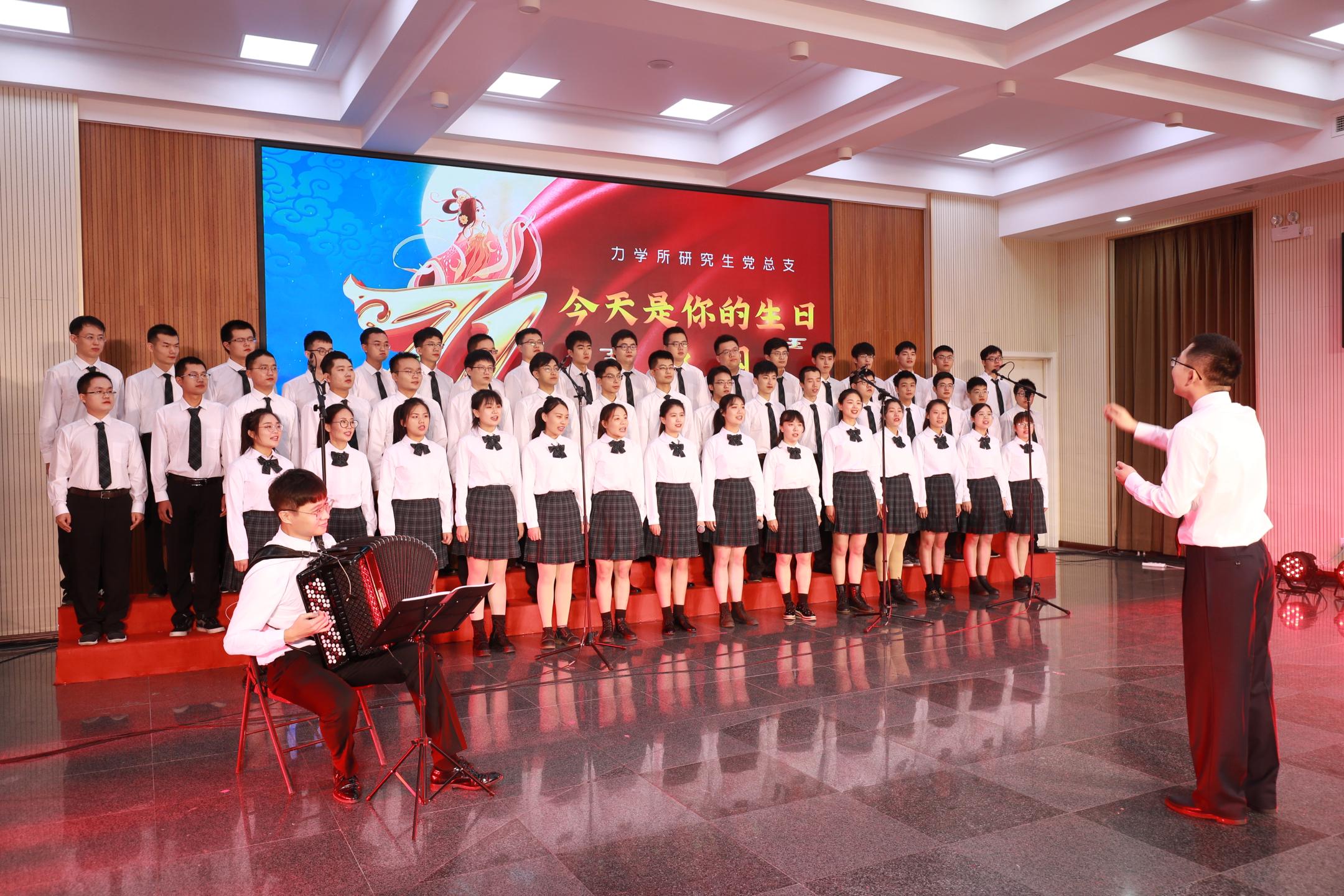 在升旗仪式后的爱国主义歌曲展演环节,各党总支党支部代表队精神饱满,展演过程气氛热烈、高潮迭起。研究生党总支洋溢着青春的气息,用歌声表达了对祖国生日的祝福,一首《强国一代有我在》发出了年轻学子的最强音。流固耦合党总支演唱了《我和我的祖国》、《共筑中国梦》,抒情和激情相结合,情真意切表达了对祖国的浓浓热爱以及对祖国美好明天的祝愿。学会办公室党支部、空天中心党支部、先进制造党支部组成了联合团队进行歌曲展演,其中一首《保卫黄河》,激扬澎湃、气势恢宏,展现了英雄儿女为保卫黄河、保卫全中国而战斗的壮丽场景。非线性党支部一首《歌唱祖国》,用明快雄壮的韵律,描绘了伟大祖国不断繁荣发展的壮丽画卷!最后的展演由高温气动党总支和微重力党支部共同完成,一首《我的祖国》委婉动听,唱出了对祖国家乡的无限热爱;一首《团结就是力量》铿锵有力,表达出全国人民团结一致、克服困难,共筑美好未来的强大信心。