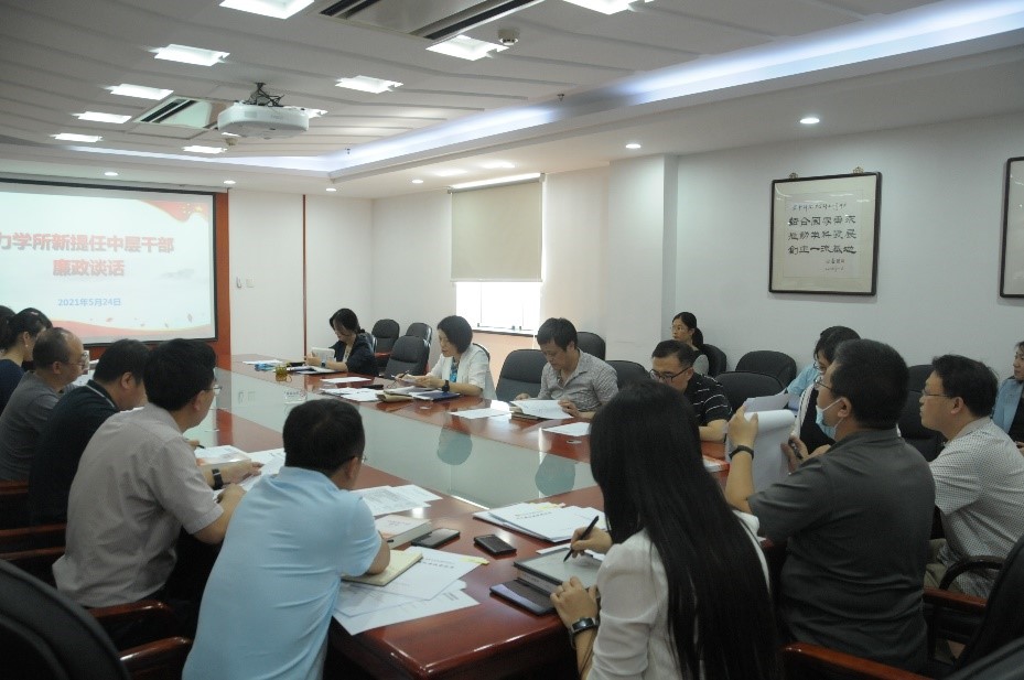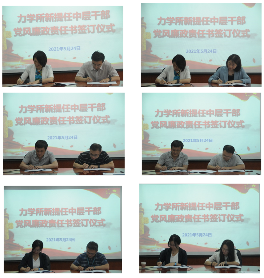 为深入贯彻落实党中央和院党组关于全面从严治党的部署要求,严格执行党风廉政建设责任制,力学所于5月24日召开了新提任中层干部廉政谈话暨党风廉政责任书签订仪式。所领导,处级以上中层领导干部参加了会议。会议由党委书记、所长刘桂菊主持。