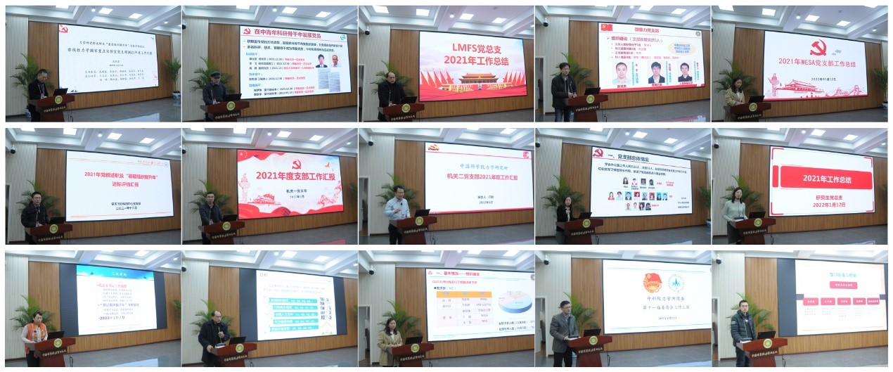 各党支部(总支)书记重点围绕支部亮点工作、落实上级和所党委工作部署、以及推进“基层组织提升年”等工作的开展情况进行了述职汇报;所工会、妇委会、共青团、研究生会等群团组织负责人也分别重点介绍了特色工作开展情况以及下阶段的工作计划。2021年是中国共产党建党100周年,也是“十四五”开局之年,各支部年度工作一方面紧密结合自身实际,扎实开展党史学习教育,策划特色实践活动,引导广大党员牢记作为科技工作者的初心使命;同时充分结合中心工作,不断强化基础研究、保障重大任务,有效推动了重大科技成果产出。机关两个党支部通过深入开展“我为群众办实事”实践活动,切实解决了一些职工群众急难愁盼的问题,进一步提升了机关管理效能。在推进“基层组织提升年”工作方面,各党支部结合方案要求,主动查摆问题,推进整改落实,进一步提升了支部组织力,作到了让党旗在基层一线高高飘扬。各群团组织在年度工作中能够充分发挥凝心聚力的作用,深入思考职工、研究生等不同群体所面临的困难,准确把握实际需求,不断强化组织领导、完善管理体系,策划实施了一系列特色活动,充分调动了所内各群体的参与热情,营造研究所健康、和谐、创新、向上的文化氛围。