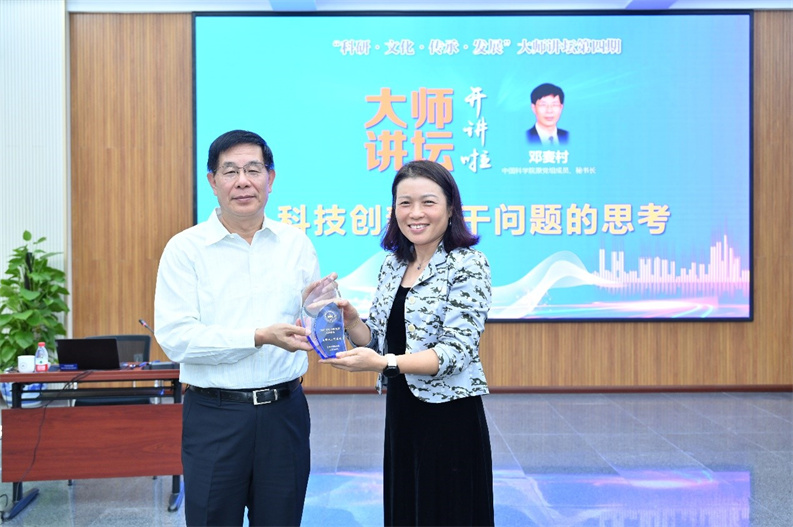 最后,刘桂菊为主讲嘉宾邓麦村秘书长颁发了“大师讲坛”纪念杯。