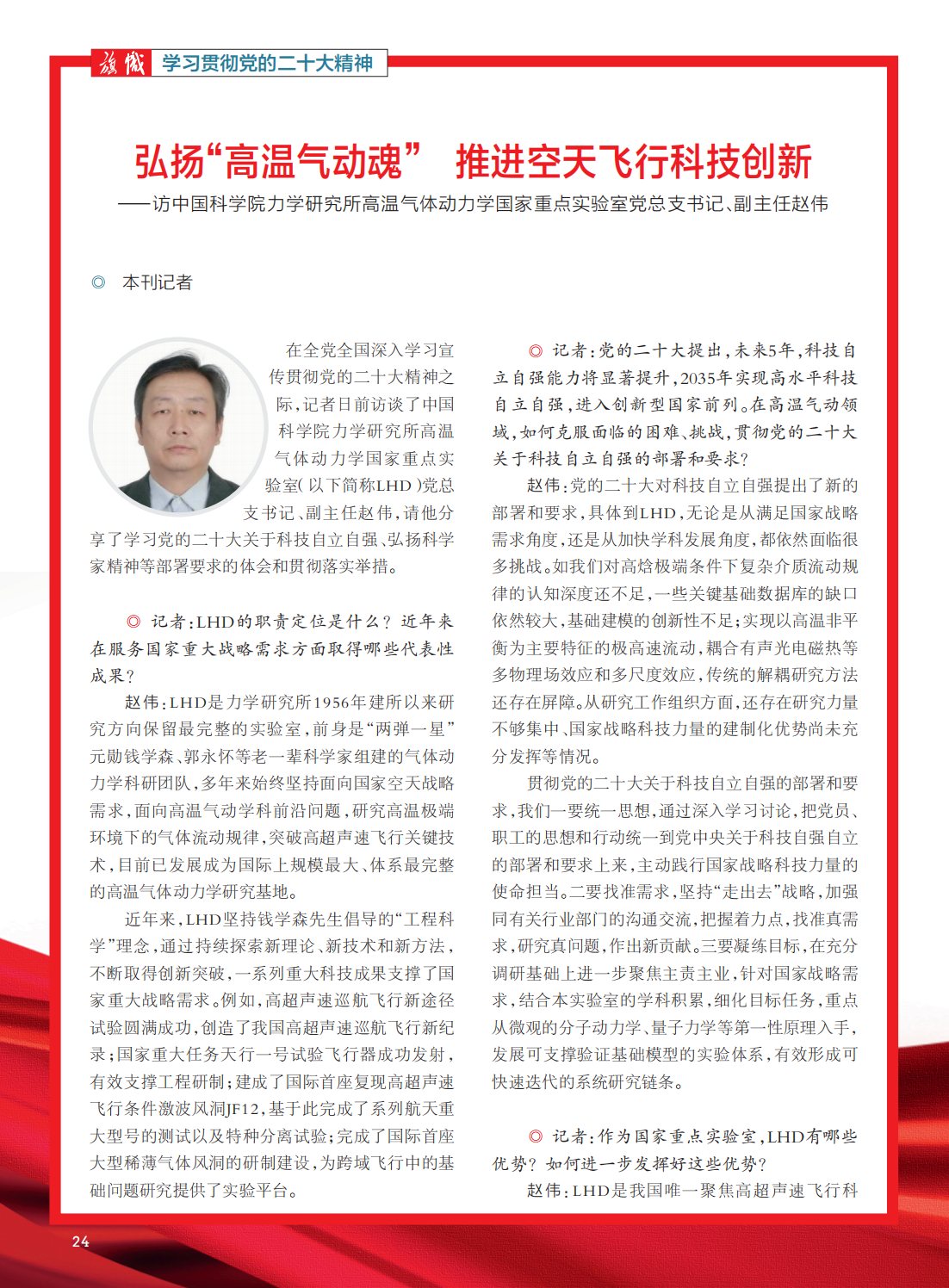 近日, 由所党委策划部署,中央和国家机关工作委员会主管的《旗帜》杂志首次刊登了力学所基层党组织专访文章《弘扬“高温气动魂”推进空天飞行科技创新——访中国科学院力学研究所高温气体动力学国家重点实验室党总支书记、副主任赵伟》,从“服务国家重大战略需求”“贯彻党的二十大关于科技自立自强的部署和要求”“发挥国家重点实验室优势”“落实党的二十大对弘扬科学家精神、推进事业单位党建工作”等方面宣传报道LHD党总支党建工作经验做法(http://www.qizhiwang.org.cn/n1/2023/0110/c448822-32603710.html)。