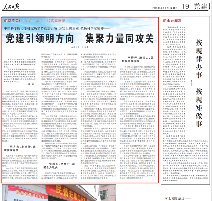 8月1日,人民日报第19版刊登了力学所党建工作专题文章《党建引领明方向 集聚力量同攻关》,文章深入科研一线,以科研人员视角讲述了力学所党委在坚持政治引领、夯实组织基础、弘扬科学家精神等方面谋划实施的系统举措,以党建引领促进科技攻关所取得的系列重大成果。