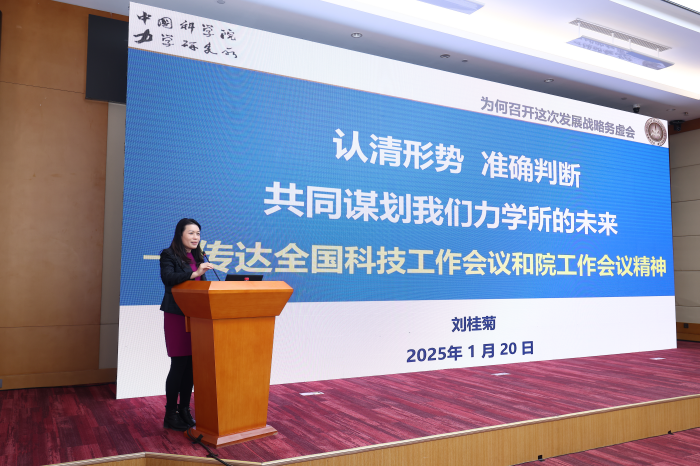 1月20日,力学所组织召开党委理论学习中心组(扩大)会议,党委书记刘桂菊作题为《认清形势 准确判断 共同谋划力学所未来——传达全国科技工作会议和院工作会议精神》的专题报告,深入学习领会全国科技工作会议精神,传达部署中国科学院2025年度工作会议精神。研究所党委理论学习中心组成员、各部门负责人、基层党组织负责人、科研骨干代表等100余人参加会议。