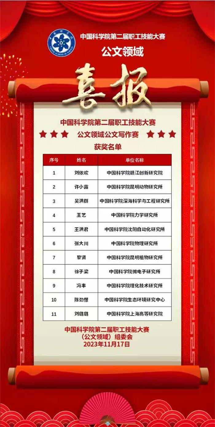 近日,中国科学院举行第二届职工技能大赛,力学所综合处王艺获“中国科学院第二届职工技能大赛技能标兵(公文写作)”称号。