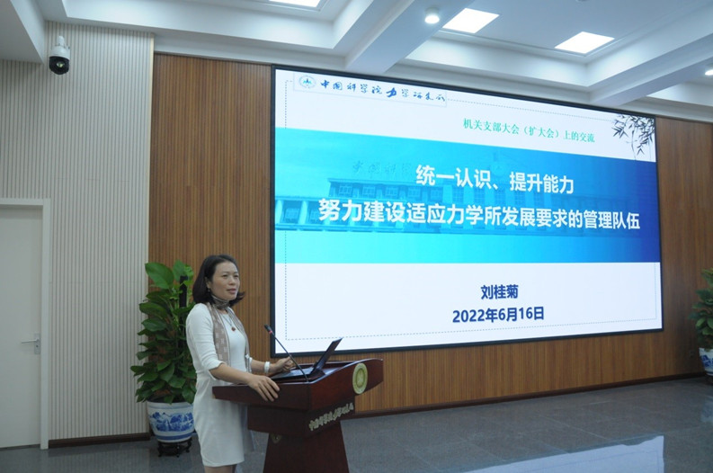 刘桂菊作题为《统一认识、提升能力,努力建设适应力学所发展要求的管理队伍》的党课报告。她通过数据多维度分析了力学所管理队伍情况,阐述了哥廷根应用力学学派起源到“工程科学”思想办所理念的发展脉络,指出了新时期力学所作为力学领域“国家队”的使命担当;她结合自身工作经历分享了对管理工作的体会,希望大家勤练履职尽责的基本功,不断提升核心竞争力,努力把工作做到位,成为信念坚定、为民服务、勤政务实、敢于担当、清正廉洁的好干部。