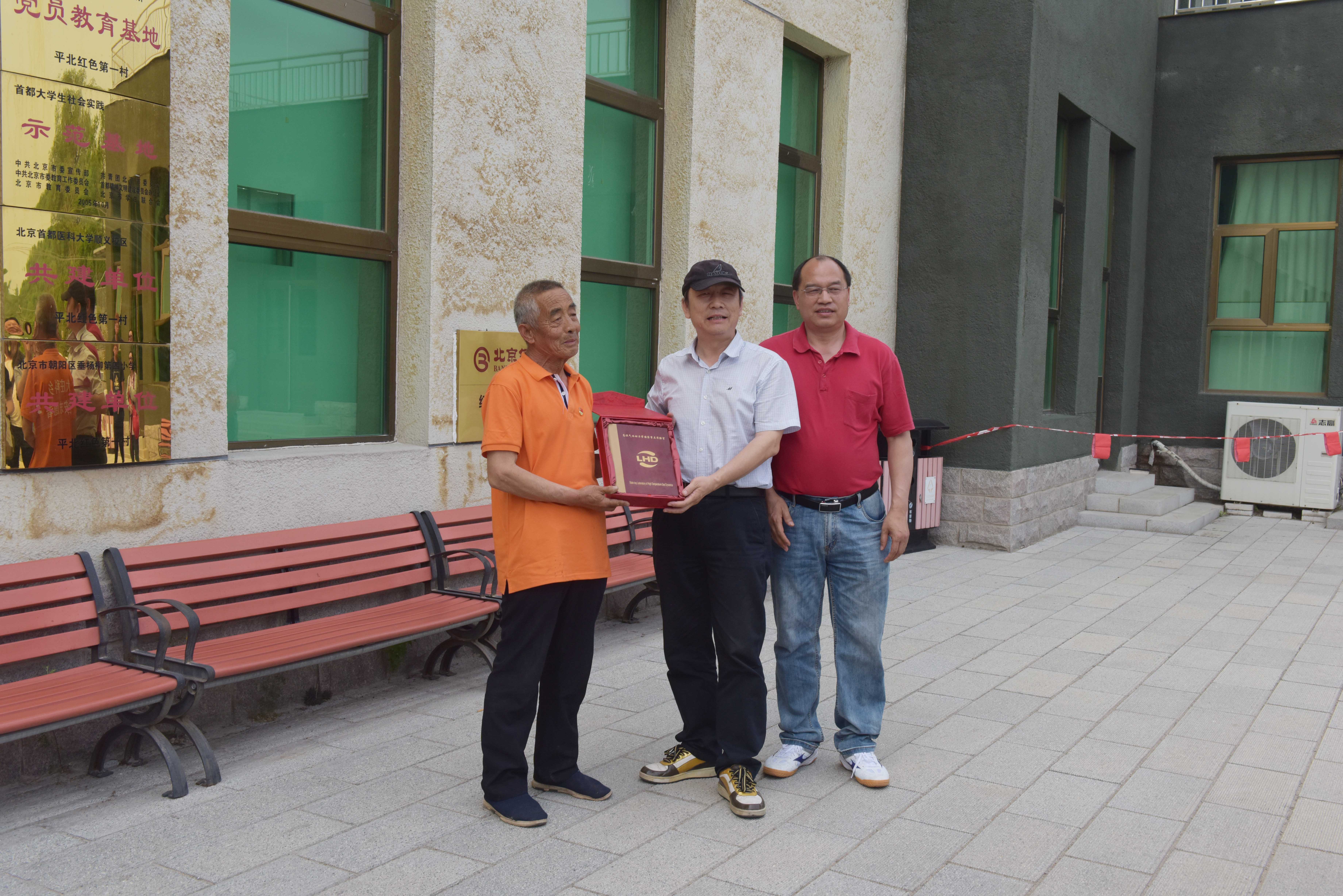 随后大家前往沙塘沟村,参观“平北红色第一村”纪念馆。纪念馆展示的图文、蜡像和实物,再现了战争年代的峥嵘岁月,唤起了大家对民族英雄的敬仰。支部向沙塘沟村老主任、老书记胡永旺赠送特色纪念品,以表达LHD党员不忘初心、牢记使命的决心。