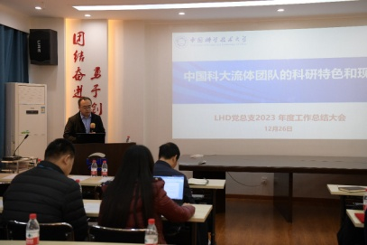 首先,赵伟作党总支工作年度进展报告。报告从 “三个清单”落实情况、日常党建工作、特色党建活动等方面对实验室的年度党建工作进行全面总结,并针对2024年提出工作计划。报告着重介绍了党总支编辑的“三个清单感悟文集”,该文集是党员同志们真情实意表达了对科技创新、抢占科技制高点的认知,反映了大家对实验室和团队未来发展的信心,更体现了实验室党总支的凝聚力和内驱力。党总支下一步将以国家重大需求为导向,进一步加强内外交流,充分调动党小组的基层战斗堡垒作用,积极推进跨团队新型党建模式,加速LHD党建和科研融合进程,促进实验室科研产出。