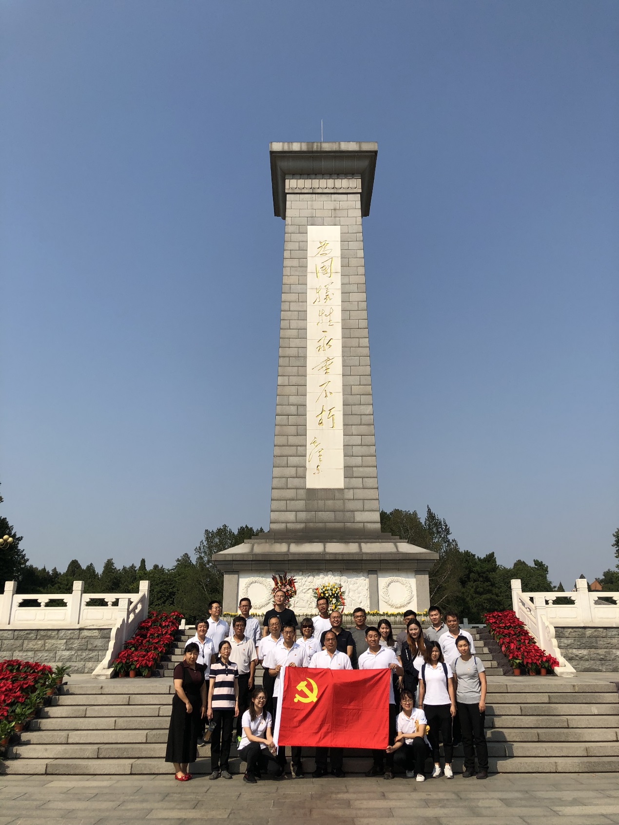 在全国庆祝建国70周年之际,我们不能忘记为人民解放和民族独立而牺牲的烈士。928日,支部党员又来到华北军区陵园开展瞻仰祭扫活动。华北军区烈士陵园是1948年秋经朱德总司令提议,为了纪念抗日战争、解放战争时期牺牲在华北大地的革命烈士而修建,园内安葬着马本斋、周建屏、常德善、包森、周文彬等历次革命历史时期牺牲在华北地区的318位团职以上的革命烈士,安放着650多位烈士和老红军的骨灰,国际主义战士诺尔曼·白求恩和柯棣华大夫均安葬于此。烈士陵园门口,毛主席的诗词“为有牺牲多壮志,敢叫日月换新天”深深地震撼了大家。陵园中央矗立着一座纪念碑,高大而雄壮,它见证了历史,见证了华北人民反抗侵略的不屈斗志。烈士们大多是在年轻的时候就为了解放事业献出了自己的生命,他们为了国家的解放,人民的利益,不惜将自己的年轻热血洒在这片土壤上,他们是永远的先驱者,是永远的丰碑。
