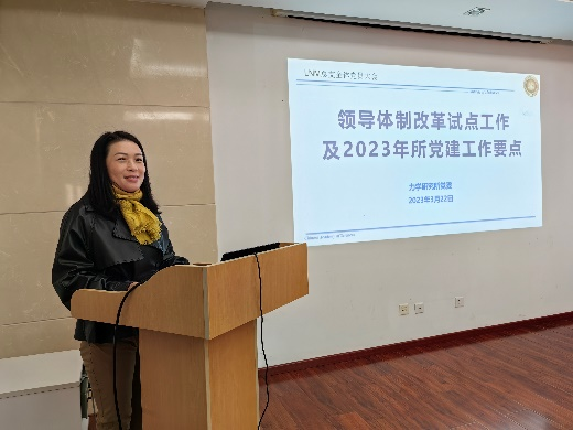 刘桂菊作了关于领导体制改革试点工作及2023年研究所党建工作要点的报告。介绍了领导体制改革重要意义、推进情况和下一步工作安排及2023年研究所党建工作要点。她指出,在力学所开展领导体制改革试点工作,是院党组着眼力学所长远发展大局作出的重要决定,是对力学所党建引领科研促进发展各方面工作的高度认可。力学所党委高度重视领导体制改革试点工作,成立了专班,制定了详细的工作计划。她还强调,党总支和党支部要充分发挥支部战斗堡垒作用,明确“三个清单”目标任务,不断推进党建与科研深度融合。实验室党政班子要共同努力,进一步统一党员职工思想认识,着力解决党员职工急难愁盼的问题,带领实验室健康发展。与会人员围绕报告进行了热烈讨论与交流。