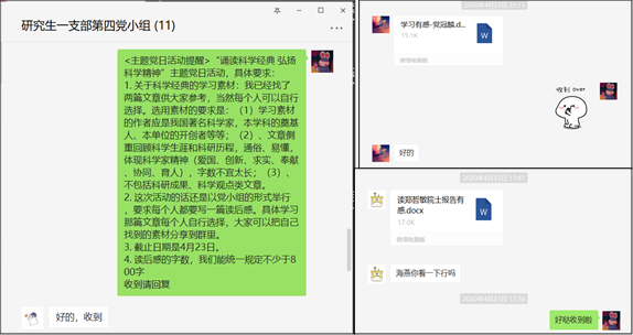 为学习传承老一辈科学家的精神,按照京区事业单位党委和力学所党委的部署,2020年4月15日至21日,研究生一支部各党小组分别通过微信群交流及视频会议的方式召开了“诵读科学经典,弘扬科学精神”主题党日学习活动,此次活动由各党小组组长负责召集并主持。通过在线分享与讨论,各位党员同志相互交流所思所想,更加全面、深刻地学习了老一辈科学家们的科学精神,也明确了今后自己的努力方向。