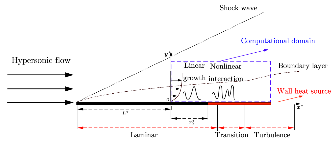 边界层转捩是高速飞行器气动性能设计的关键瓶颈问题。在转捩过程中,飞行器表面的摩擦阻力和热流常会骤增数倍,因此,有效推迟转捩对于优化飞行器气动性能与热防护设计至关重要。对于环境扰动较弱的高空飞行工况,边界层转捩由Mack模态扰动的放大触发,其过程涵盖感受性、线性失稳及非线性共振等阶段。传统转捩控制方案主要聚焦于抑制失稳模态的线性增长率,但此类方案通常仅在特定频带内有效,而在其他频带可能产生不利影响。近期,力学研究所与天津大学合作研究团队提出了一种针对扰动非线性演化阶段的调控新思路,旨在实现宽参数范围内的转捩延迟。该研究在利用壁面温度控制手段调控高超声速边界层基频共振效应及其物理机理方面取得突破性进展。相关成果以“Control of hypersonic boundary layer transition by suppressing fundamental resonance using surface heating”为题,发表于流体力学领域顶级期刊 Journal of Fluid Mechanics。