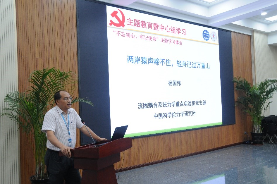 杨国伟作了题为《“不忘初心、牢记使命”学习体会--两岸猿声啼不住,轻舟已过万重山》的主题发言。他首先简要回顾了在中国共产党的带领下新中国科技与经济的发展历程以及取得的巨大成绩;从组成本质、历史文化、理论实践等多方面详细阐释了中国共产党、中国特色社会主义制度的与众不同,强调我们要始终坚定“四个自信”,做到“两个维护”;并以高铁为例,对比美国高铁和中国高铁建设,介绍了中国高铁建设取得的突出成绩,彰显了中国特色社会主义制度的先进性与优越性;最后强调,科研人员要坚守“创新为民、科技报国”的初心与使命,在“为中国人民谋幸福、为中华民族谋复兴”的伟大征程中作出国家战略科技力量应有的贡献。