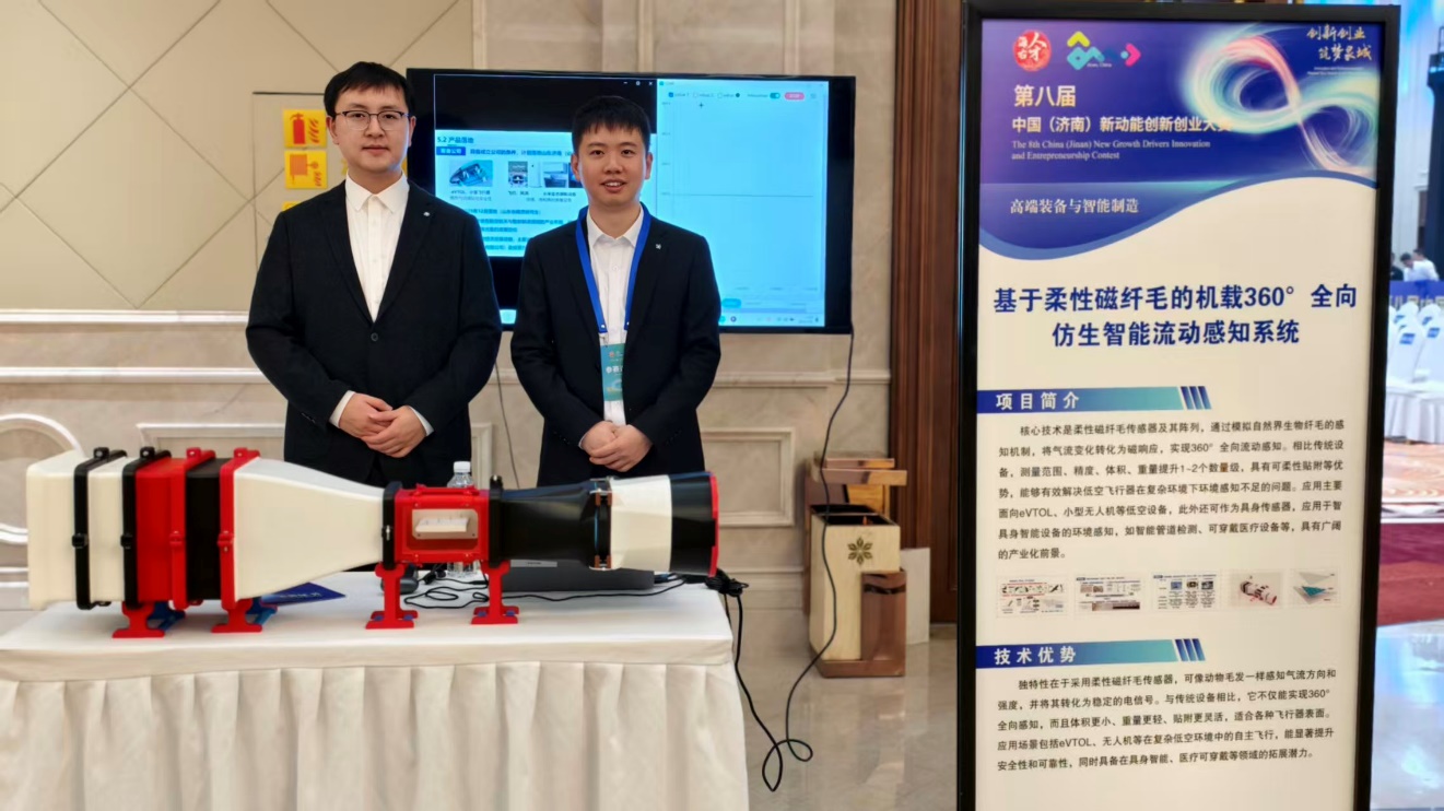 该项目聚焦低空飞行器在复杂风场环境下的流动感知核心需求,受到自然界生物启发,创新提出基于柔性磁纤毛传感阵列的机载全向仿生智能流动感知新技术。该技术突破传统侵入式流动感知技术在测量范围、精度、信息维度与结构适配性等方面的局限,具备小型化、全向感知、高冗余性与结构可集成性强等优势。目前,项目已顺利完成原理验证与样机测试,未来将持续推进传感技术在电动垂直起降飞行器、工业无人机等低空飞行器上的工程化应用,目标实现与飞控系统深度耦合,打造“感知-决策-控制”一体化智能新范式。