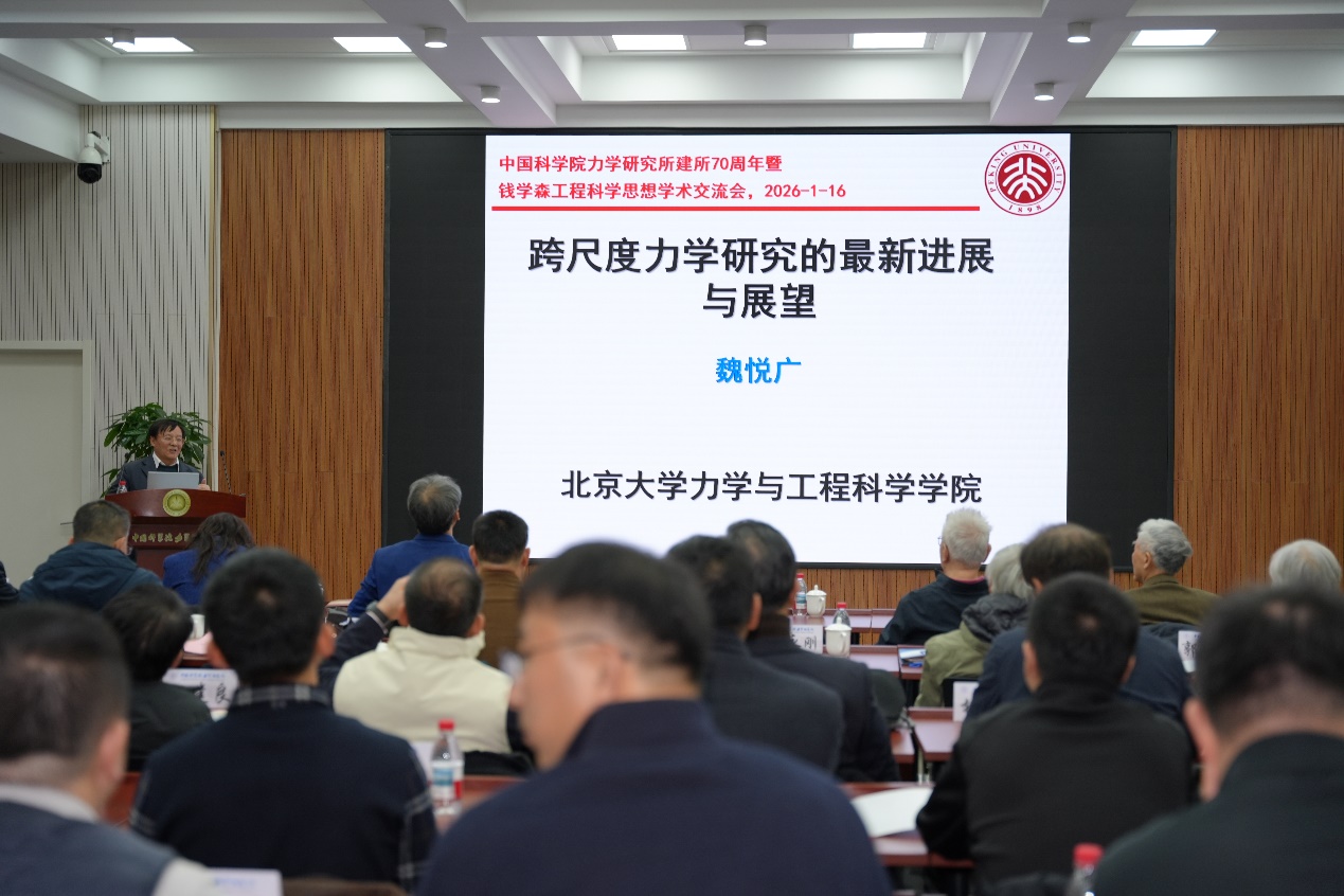 2026年1月16日,钱学森工程与技术科学思想学术交流会暨《迈向新高度》新书发布会在力学所举办。会议旨在回顾力学所七十载奋斗历程,探讨钱学森工程与技术科学思想的时代价值,展望力学学科未来发展前景。力学所胡文瑞院士、李家春院士,北京大学魏悦广院士,力学所学术所长、中国力学学会理事长何国威院士,浙江大学吴汉明院士,大连理工大学郭旭院士,北京航空航天大学王晋军院士,北京理工大学姚裕贵院士,上海交通大学钱学森图书馆馆长、钱学森先生之子钱永刚教授,北京照相机总厂研究所原所长、钱伟长先生之子钱元凯教授,北京大学教授、朱兆祥先生之子朱星教授,国防科技大学易仕和教授,中国工程物理研究院副院长赵剑衡研究员,中国科学院工程热物理研究所所长陈海生研究员、空间应用工程与技术中心党委书记黄晨光研究员,世界知识出版社总编辑汪琴等出席会议。来自各高校、行业部门、兄弟院所专家学者,力学所所友、科研人员、离退休老同志、研究生等代表230余人参加会议。大会开幕式由力学所所长黄河激主持。