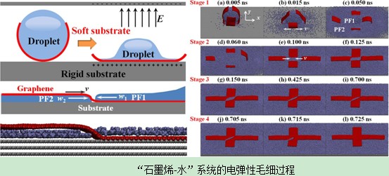 最近,博士研究生朱雪燕、袁泉子博士和赵亚溥研究员采用大规模分子动力学模拟结合理论研究了“石墨烯-水”系统的电弹性毛细过程,发现由两个前驱膜的相互竞争所引起的毛细波的产生、传播和消失在电弹性毛细中起着重要的作用。在毛细波的传播过程中,石墨烯上的前驱膜将包裹的石墨烯撑开,基底上的前驱膜钻入石墨烯与基底之间将石墨烯从基底上剥离。基底和石墨烯上的两个前驱膜的相互竞争导致毛细波的产生,毛细波的传播由两个前驱膜的驱动功之差控制,并且波速不依赖于电场强度的大小。从理论上推导出了毛细波的色散关系以及波速的表达式,与模拟统计得出的结果在一个数量级上。