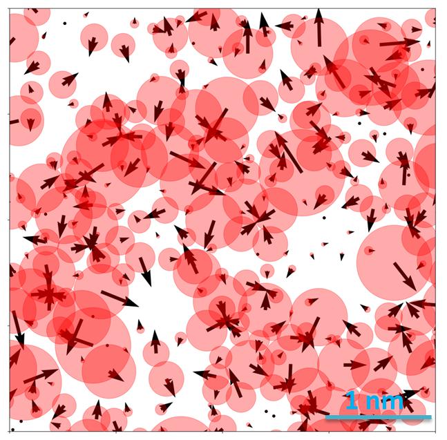 图 1:玻璃“玻色峰”的方向序。其中,原子(红色圆圈)的大小代表了玻色峰强度,黑色箭头的长度代表了方向序的模长。方向序的空间分布呈现了玻色峰的准局域振动特性。