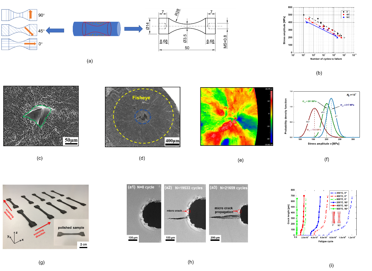 图1 增材制造Ti-6Al-4V材料高周、超高周疲劳及不同温度下疲劳裂纹扩展性能 (a) 高周、超高周疲劳测试试样 (b) S-N曲线 (c) 裂纹源 (d) “鱼眼状”断口形貌 (e) 裂纹源粗糙度 (f) 超高周疲劳强度统计分布 (g) 裂纹扩展原位测试试样 (h) 裂纹扩展形貌 (i) 不同温度下、不同制备取向试样,裂纹长度随疲劳周次变化。