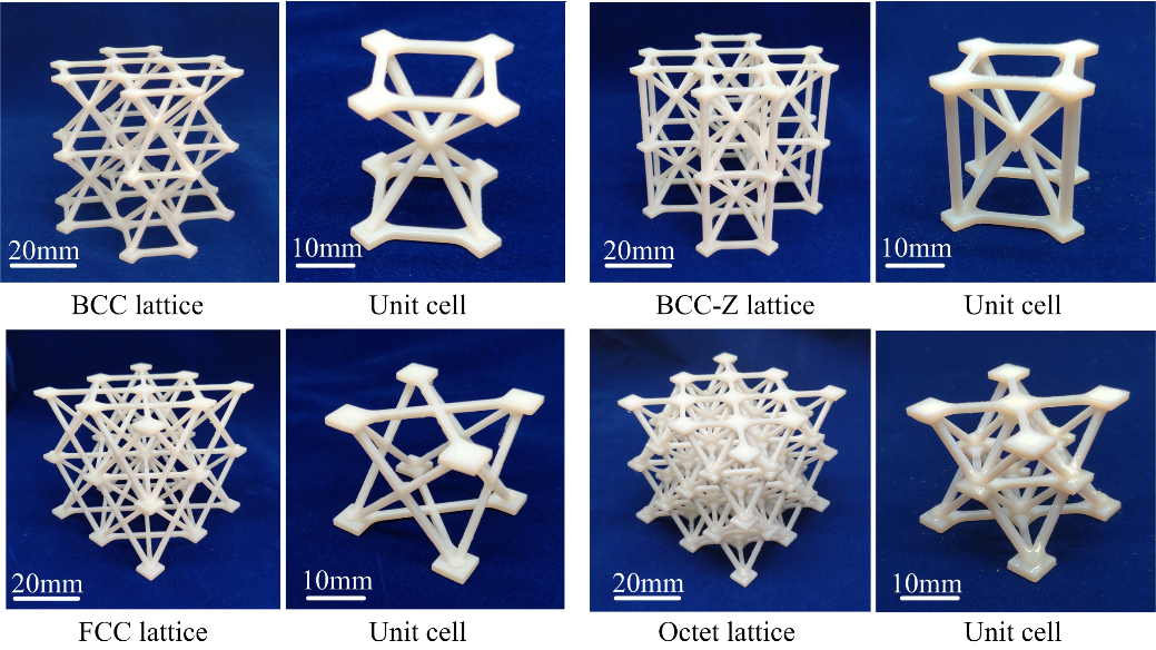 进一步将该方法拓展到聚合物喷射成型(PolyJet)技术中,制备了BCC、BCC-Z、FCC、Octet四类典型的点阵结构,实现了不同构型的PolyJet点阵结构中杆件的最佳打印方向(X-Y平面)。