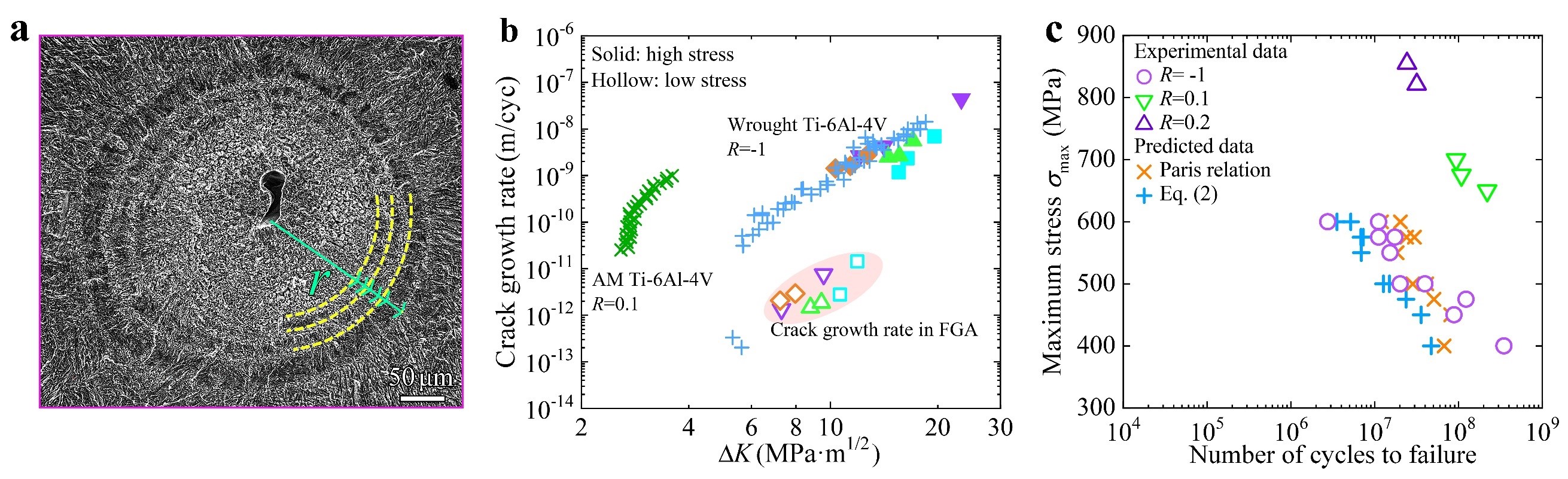 图3 增材TC4钛合金超高周疲劳裂纹萌生和初始扩展速率与寿命预测. a: 变幅加载下SEM照片(σα,H= 600 MPa, σα,L= 400 MPa, R=–1, σα,L下累积1.6×108周次). b: 裂纹萌生和初始扩展区域(Fine Granular Area, FGA)内等效裂纹扩展速率与文献中裂纹扩展速率的比较. c: 不同应力比下S–N数据以及R=–1下疲劳寿命预测结果与实验结果的比较.