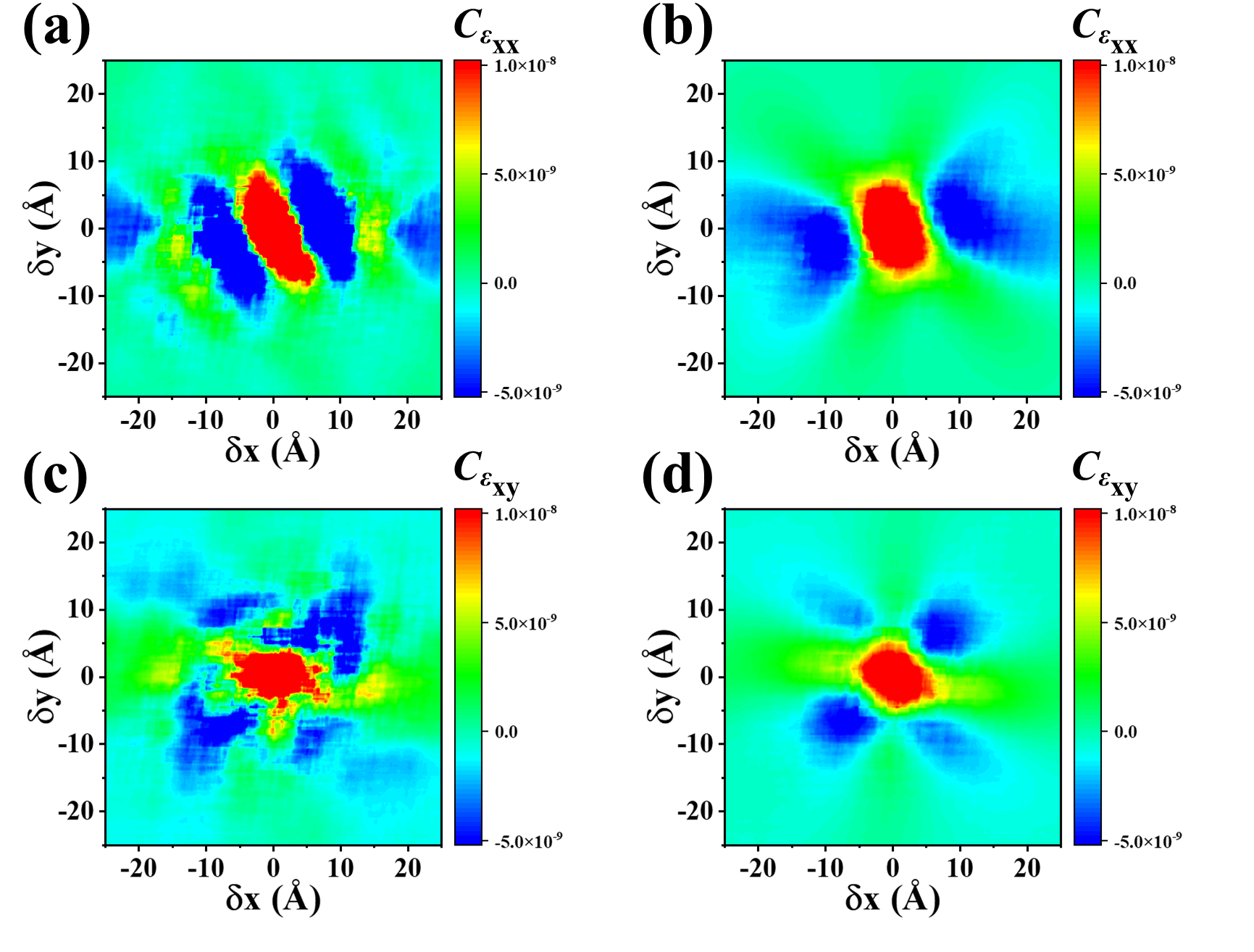 图:剪切转变的应变关联场比较,(左)原子尺度模拟结果,(右)基于Eshelby夹杂理论的重构结果