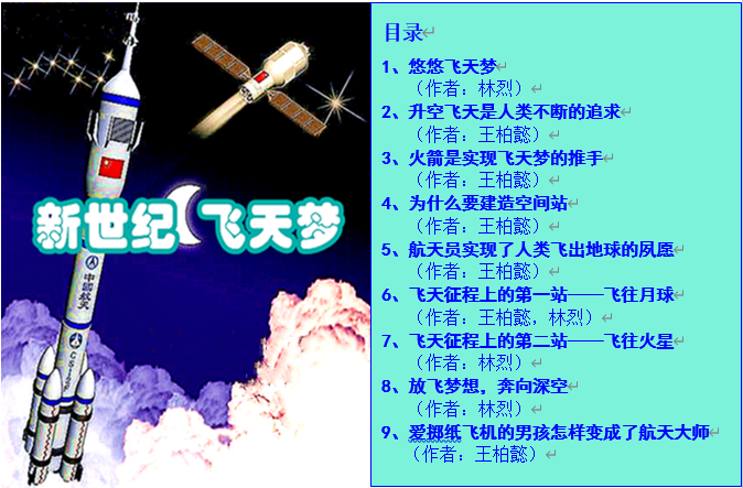编者按:《新世纪飞天梦》是中国科学院力学研究所的王柏懿和林烈两位研究员撰写的一部科普小书。它图文并茂,以通俗的语言、严谨的分析和详实的史实,展示了人类不懈追求升空飞天的艰辛历程,说明了各类航天飞行器的基本原理和主要功能,还介绍了航天大师钱学森。承蒙作者的盛意,他们同意以网络书的形式在本网站上发表全书内容。该书主要是为小学高年级和初中的学生们编写的,有些较为专深的相关知识则采用“小贴士”“知识链接”和“你知道吗?”等框图形式在文中给出。