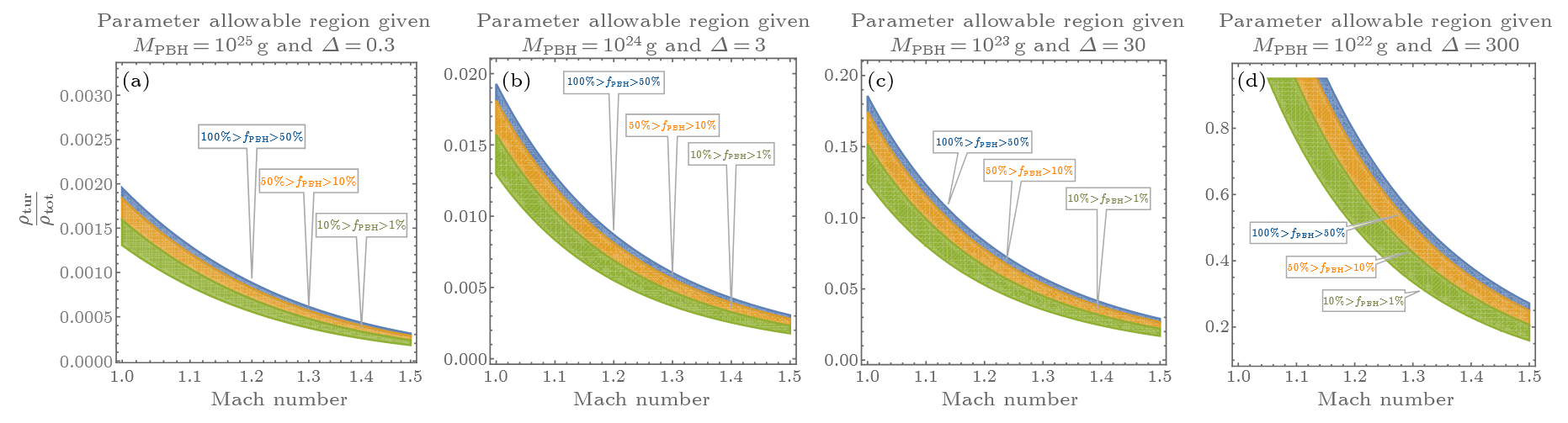 图:不同质量的原初黑洞丰度所对应的宇宙极早期湍流的能量密度与马赫数取值范围