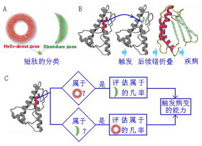 作者利用聚类分析方法,综合考虑影响蛋白质进化的突变、结构、力学属性等诸多因素,将构成蛋白质的短肽归纳为两大类别。一类以螺旋为标志性结构,另一类以β折叠为标志性结构。在正常的蛋白结构中,某一短肽只属于两大类中的一种。其处于另一类别的几率给出了该短肽触发致病性结构改变的能力。在样本分析中作者发现,算法对病变敏感区域的预测精度可达94%,病变能力越低的蛋白发病后越致命。换句话说,蛋白质中的病变敏感区域可由理论迅速标定,大量用于测定此种区域的实验资源有望得以节省。