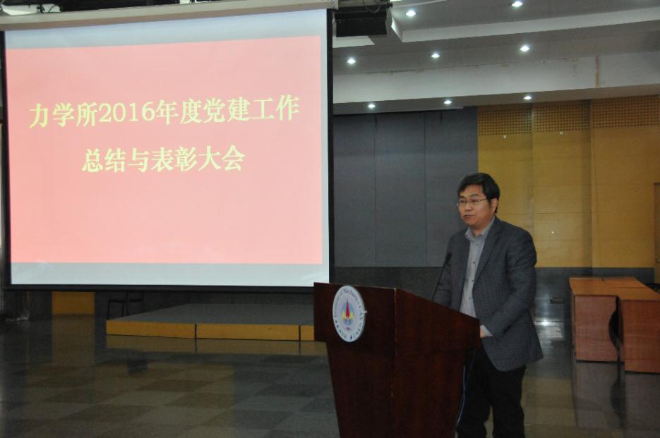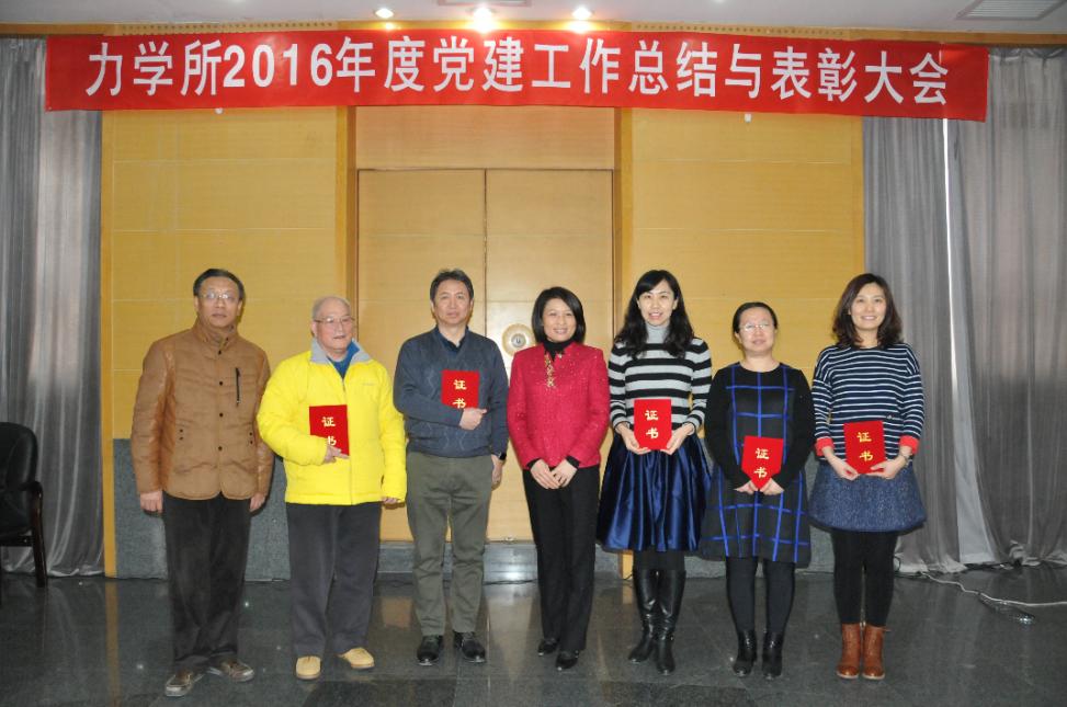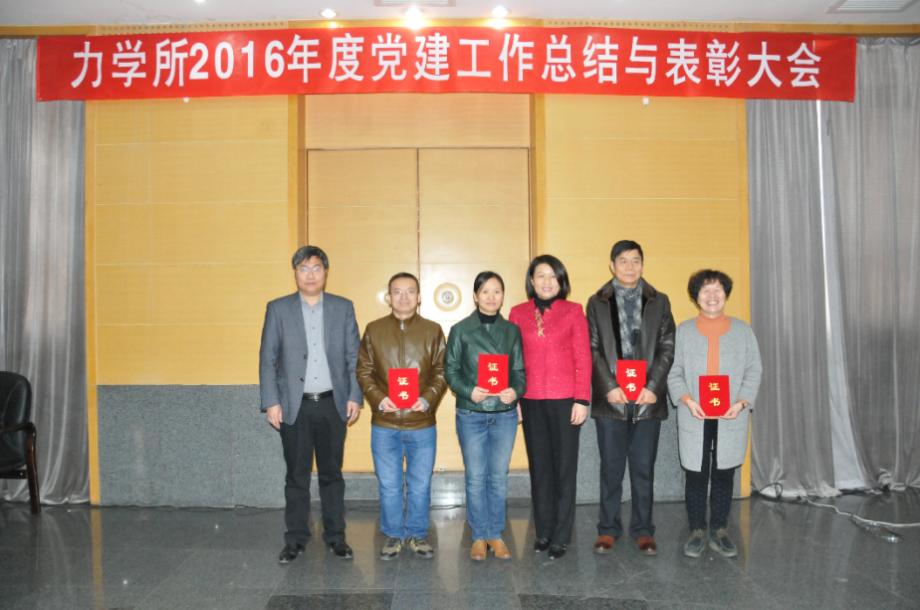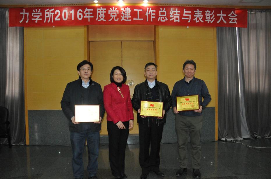 2016年,力学所党建工作中涌现出了一批先进集体和个人。戴兰宏宣读了《力学所关于表彰2016年度先进党支部、先进群团组织、优秀共产党员和优秀党群工作者的决定》,授予高温气体动力学国家重点实验室党支部、中国科学院微重力重点实验室支部2016年度“先进党支部”荣誉称号;授予力学所工会2016年度“先进群团组织”荣誉称号;授予王春、姜宗林、肖歆昕、王柏懿同志2016年度“优秀共产党员”荣誉称号;授予王宇星、刘良吉、么洁、何秀丽、张新宇同志2016年度“优秀党群工作者”荣誉称号。大会对这些先进集体和优秀个人进行了表彰,号召各党支部和广大党员向他们学习。