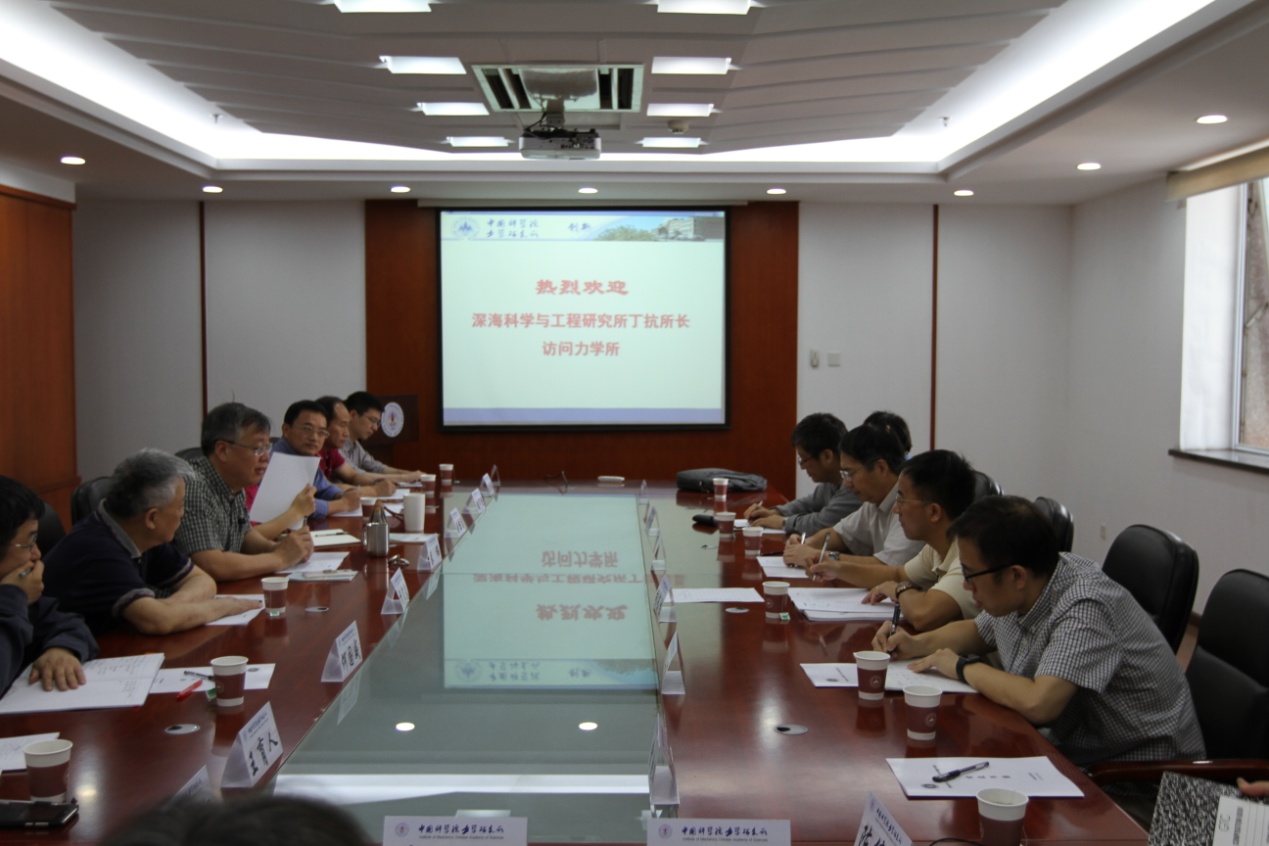 2017年5月8日上午,深海科学与工程研究所所长丁抗一行至力学研究所调研和访问。力学研究所(以下简称“力学所”)所长秦伟,党委书记、副所长刘桂菊,副所长魏宇杰,李家春院士等20余人出席会议。双方就合作事宜以及力学所海洋领域的长远发展进行了深入的交流和讨论。