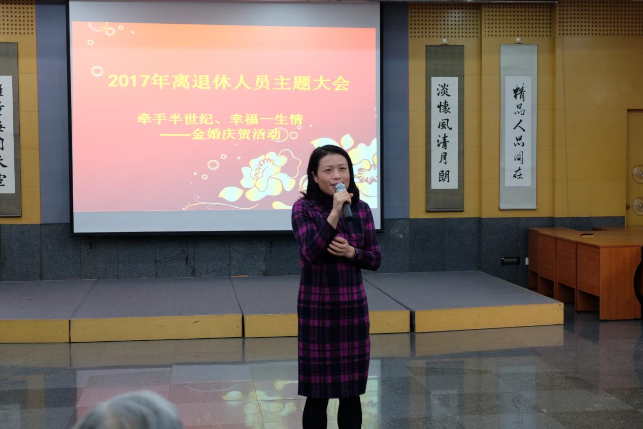 厉文萍宣布大会开始,50多对身着盛装的金婚夫妇伴着婚礼进行乐曲,手挽着手列队进入了会场,并一一进行了自我介绍。之后,刘桂菊发表了讲话,代表秦伟所长、所领导及其本人祝老人们金婚快乐、身体健康、阖家欢乐。同时,对离退休同志为所里做出的贡献给予了高度评价,并表示了衷心的感谢,表达了所里对离退休工作的重视。王薇在会上为金婚老人送上了美好的祝福。最后,金婚老人代表狄建华、薛以年分别发言,他们回顾了各自五十年来同甘共苦、相濡以沫的家庭婚姻生活。尽管经历不尽相同,但无不是与祖国同呼吸、共命运。他们也表达了对国家蒸蒸日上的发展以及十九大胜利召开的喜悦之情。整个会场充满了喜庆欢乐的气氛。