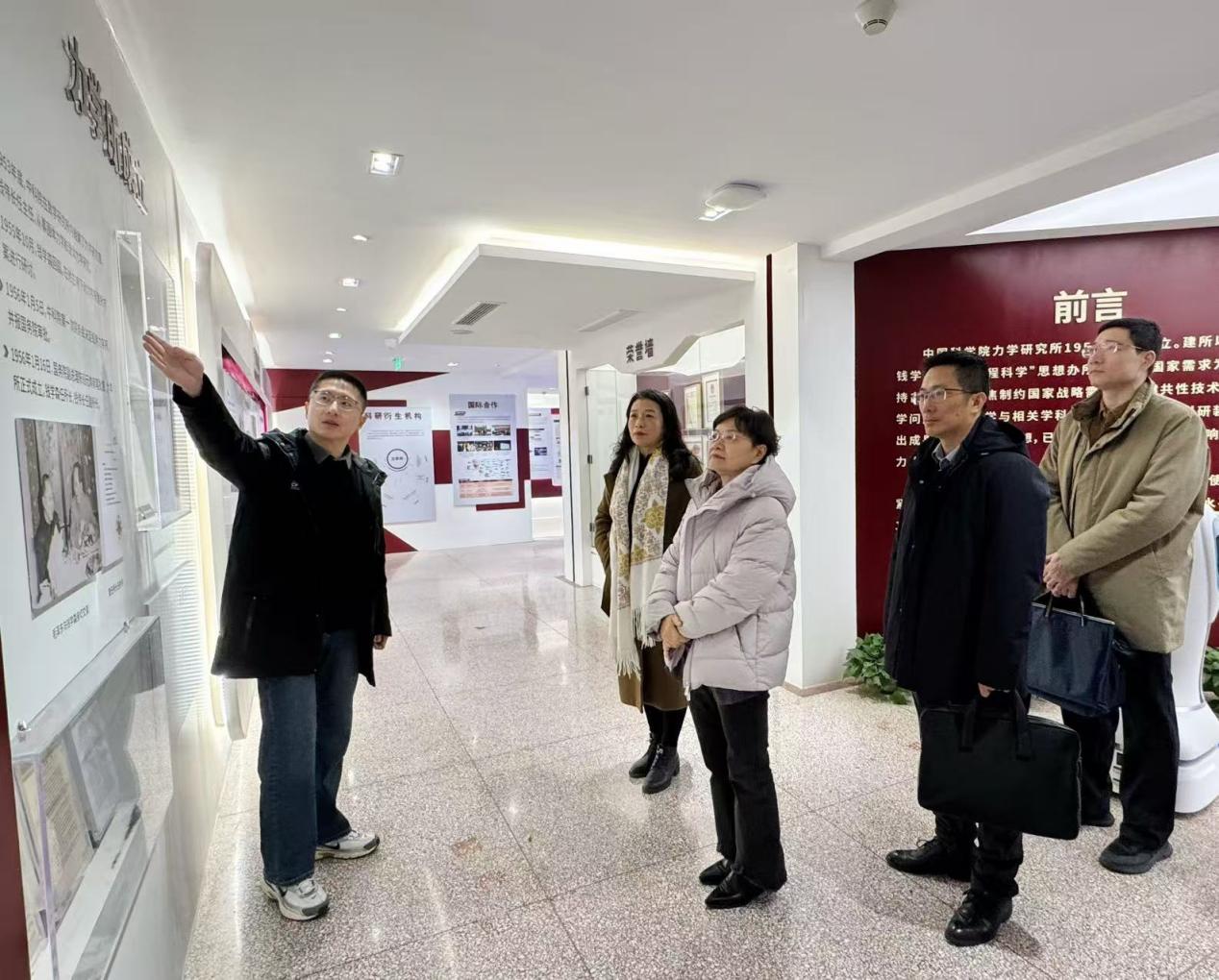 调研伊始,王月琴厅长一行先后参观了钱学森、郭永怀办公室、力学所展厅及弘扬科学家精神示范基地。一行详细了解了力学所 1956 年建所以来的发展历程、“工程科学”理念传承,以及在“两弹一星”、航空航天、海洋工程等国家重大战略任务中的卓越贡献,深刻感悟了老一辈科学家的家国情怀与严谨治学精神。