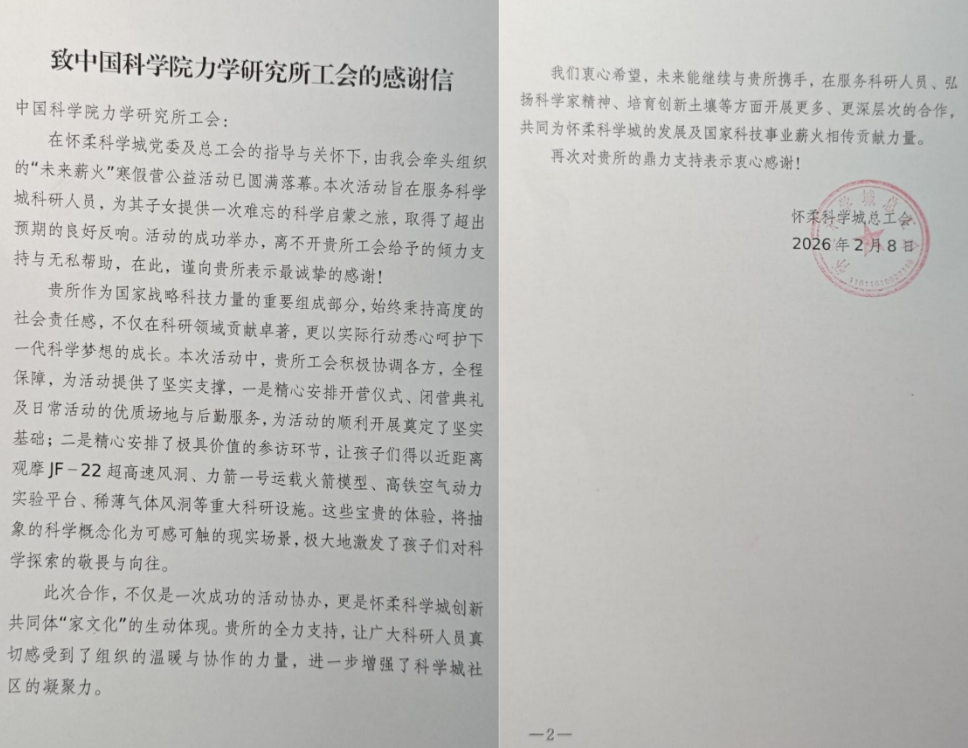 另外,怀柔园区协办了由怀柔科学城总工会组织的“未来薪火”寒假营公益活动,此项活动旨在为科学城科研人员的子女打造一场难忘的科学启蒙之旅,活动为期一周,力学所15名职工子女参与其中。由于协办得力,获得了怀柔科学城总工会的感谢信。