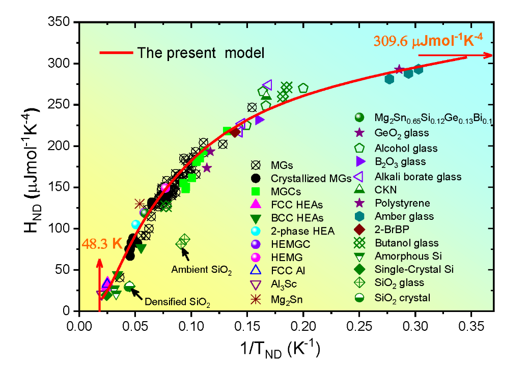 针对此学术争议,研究团队从声子散射物理规律入手,理论推导了多自由度晶格振动的阻尼系数,以及考虑阻尼软化的声子频率-波数色散关系,实现了从低波数瑞利散射到高波数米氏散射转变的光滑描述,从而将德拜线性色散拓展至非线性空间。在声子动力学格林响应函数框架下,得到了可统一描述有序晶体和无序固体(玻璃等)的声子态密度解析表达。在此基础上,研究团队以散射体特征尺寸和散射声子平均自由程为参数空间,构建了非德拜声子异常的全景相图。分析发现,如果声子色散呈现非线性连续软化,则玻色峰和范霍夫奇点可由同一实体演变为高度耦合且可相互转换的两个变体;如果声子强烈散射导致色散出现额外的局域共振软化,则玻色峰和范霍夫奇点可作为完全不同的现象而独立地同时涌现,两者共存的相边界可由理论精确确定。最后,研究团队还计算了非德拜声子异常引起的低温比热行为,并得到涵盖有序晶体到无序玻璃的143个真实固体的实验数据证实(其中55个数据由本工作测量得到),这表明建立的声子统一理论具有广泛的普适性和有效性。