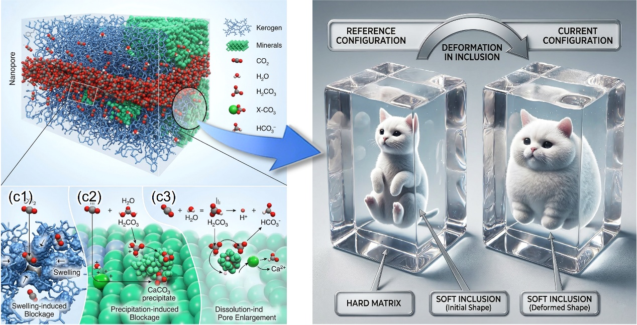 图1. 软夹杂-硬基质体系的形象化示意图:类比页岩中干酪根等软组分在硬矿物基质中的力学响应与形态演化(“猫”类比为硬基质中的软夹杂)