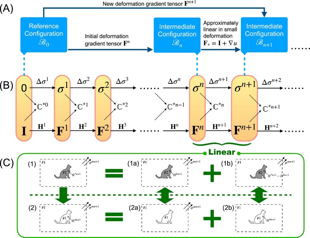 图2. 分段线性化理论与计算框架示意图。(A) 变形梯度张量在不同构型之间的乘积分解。每一增量步依托中间构型完成变形梯度张量的更新。(B) 相邻增量步之间的参数传递。(C) 从初始构型到目标构型的近似弹性加载过程表征